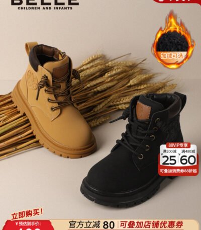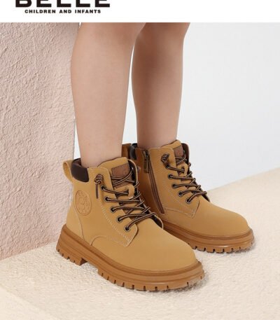 百丽童鞋儿童马丁靴冬季户外工装靴女童棉鞋宝宝加绒保暖大黄靴子