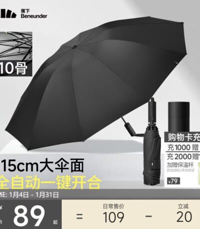 蕉下(beneunder)全自动雨伞三折加固折叠10骨伞石岩黑