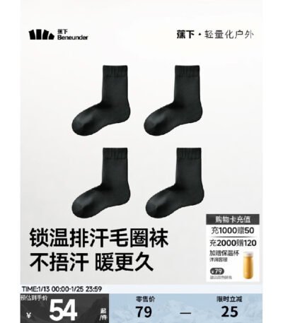 蕉下(beneunder)男女士中筒袜亲肤特护保暖秋冬吸汗保温百搭学生 漫暮黑 中筒 4双 M (40-45)