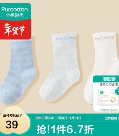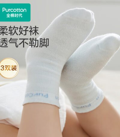 全棉时代儿童袜子婴儿棉袜宝宝新生儿地板袜男女童中长筒袜春夏秋冬 3双装 【中筒】蔚蓝+白+天蓝 3双 6-12月 (9.5cm)