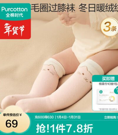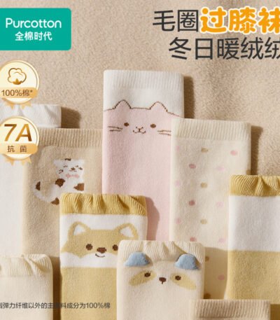 全棉时代婴幼童抗菌毛圈长筒过膝袜长筒袜秋冬儿童新生儿 小猫咪+波点+浅咖 1-3岁 【14-16cm】