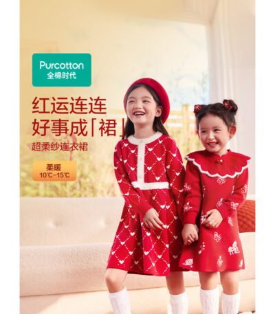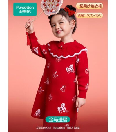 全棉时代2026新款儿童女棉线针织连衣裙红品裙子新年拜年服童装公主裙 【26年新款】金马送福 110