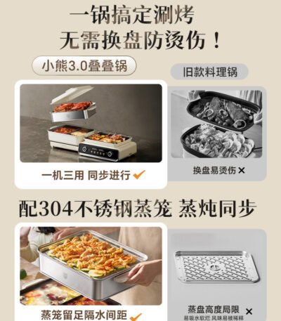 小熊叠叠锅烤涮蒸一体锅家用火锅蒸锅电烧烤炉烤肉盘多功能料理锅