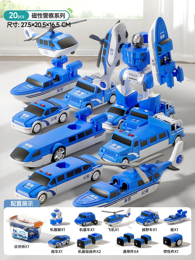 9合1变形磁力机器人【80+玩法】20件套「收纳桶」警察