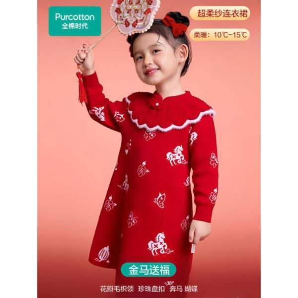 全棉时代2026新款儿童女棉线针织连衣裙红品裙子新年拜年服童装公主裙 【26年新款】金马送福 110