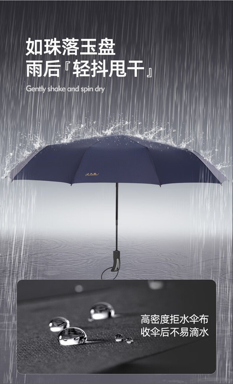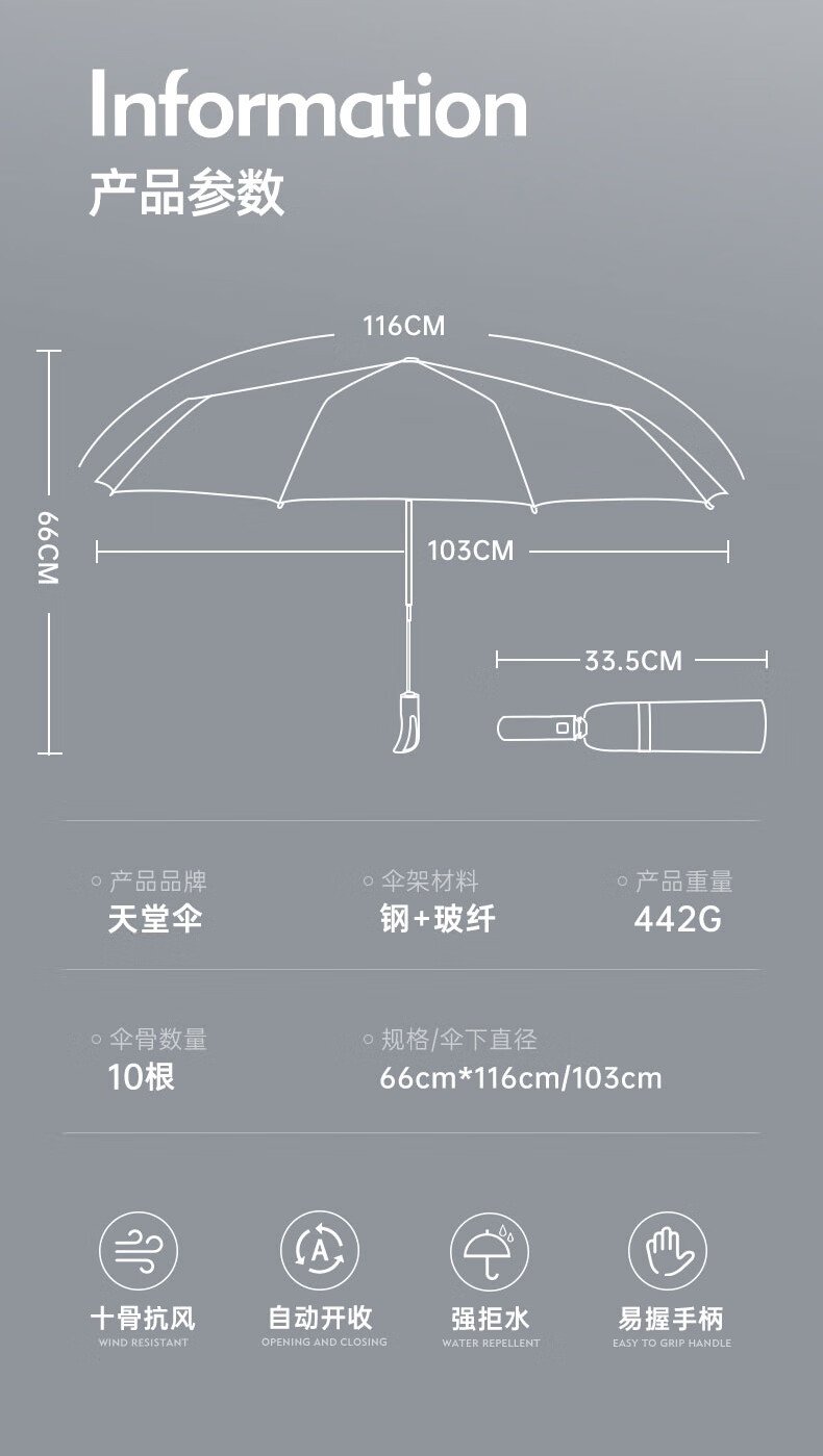 天堂 全自动雨伞三折 10骨加固一键开收易甩干简约晴雨伞 乌木黑 数量
