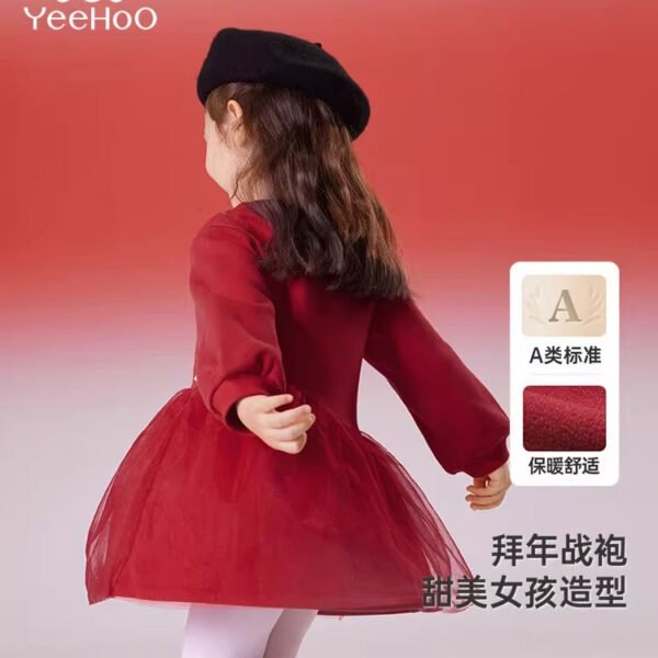 英氏女童连衣裙春季加绒秋冬儿童过年喜庆拜年服红色新年周岁裙子