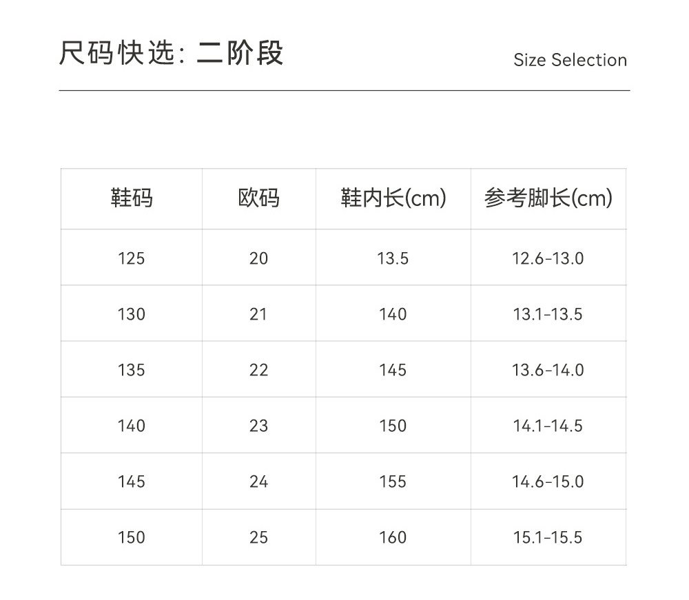 20码 内长13.5cm,建议脚长12.6-13.0cm