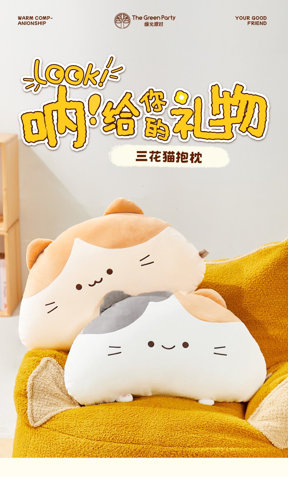 TheGreenParty三花猫抱枕毛绒玩具公仔玩偶睡觉抱枕生日礼物儿童